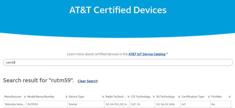 Devices under the product codes RUTM59 0*****1 are certified for use in the AT&T network and can be found on the AT&T website among certified devices: