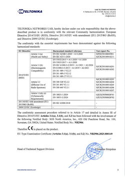 | EN 55032:2015 + A11:2020 + A1:2020 EN 55035:2017 + A11:2020 EN IEC 61000-3-2:2019 + A1:2021 + A2:2024 EN 61000-3-3:2013 + A1:2019 + A2:2021 EN 301 489-1 V2.2.3 EN 301 489-3 V2.3.2 EN 301 489-17 V3.3.1 |