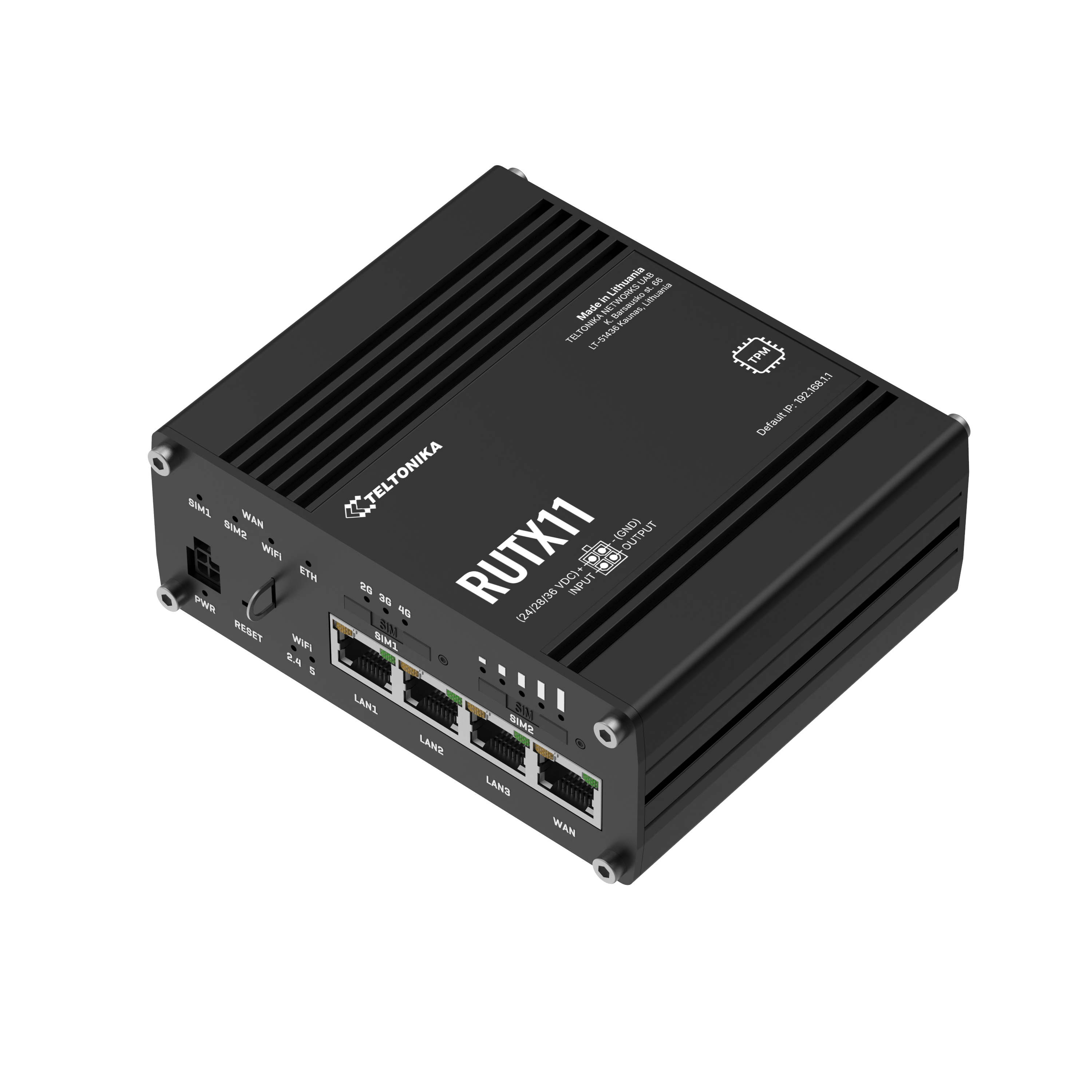 RUTX11 is a robust industrial LTE Advanced (LTE-A) router equipped with 4x Gigabit Ethernet ports, WiFi, Dual-SIM, GPS, Bluetooth, a powerful CPU and RutOS software for advanced networking solutions.