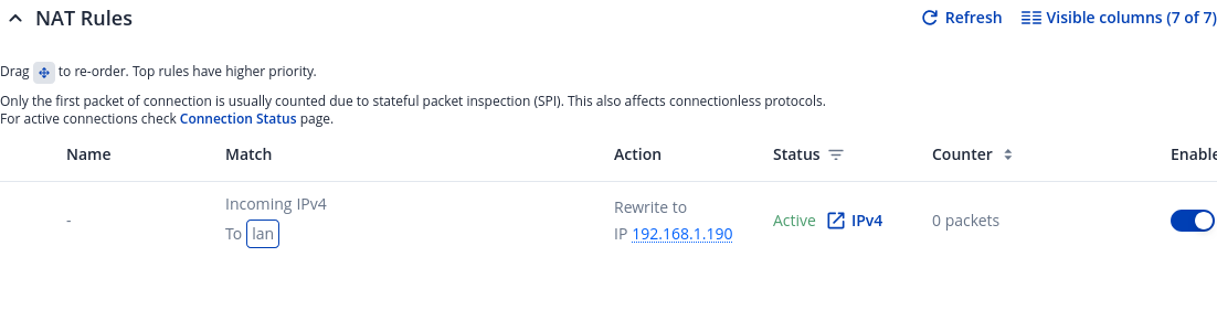 | Action | SNAT | MASQUERADE | ACCEPT; default SNAT | NAT action to use on matched traffic.