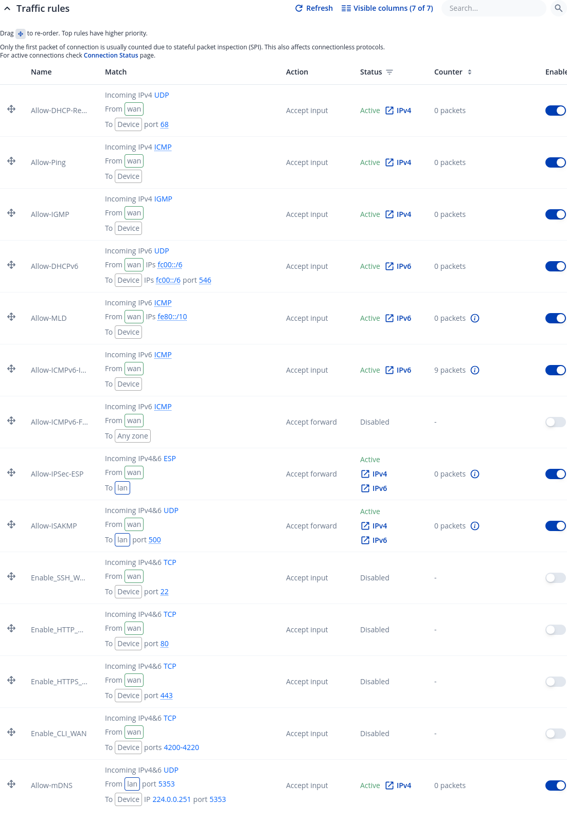 | Enable remote ping requests | off | on; default: on | Allows remote (WAN zone) ICMP echo-request type. |