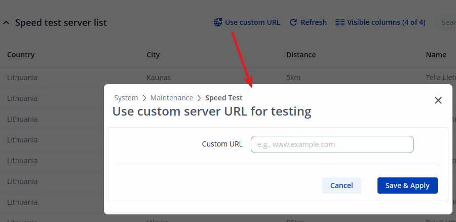 Another way to use the speed test with a custom server is to click 'Use custom server URL' and enter your server URL (only official speed test servers with port 8080 are acceptable).