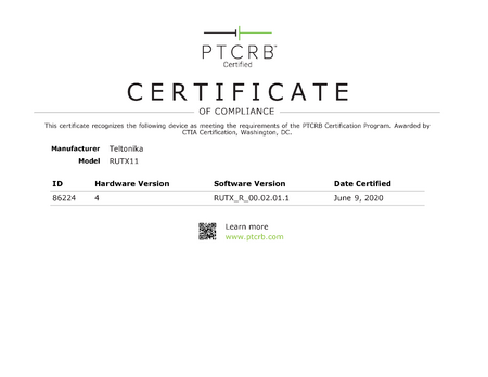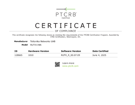 The attached certificate recognizes devices under the product codes RUTX11 1*****1 as meeting the requirements of the PTCRB Certification Program.
