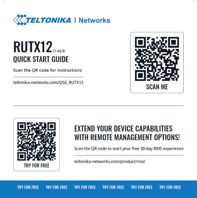 RUTX12 devices manufactured starting from Q4 2022 will have a new QSG flyer in the packaging. The new QSG flyer includes the short version of QSG with a QR code/link to the full Web QSG version: teltonika-networks.com/QSG_RUTX12