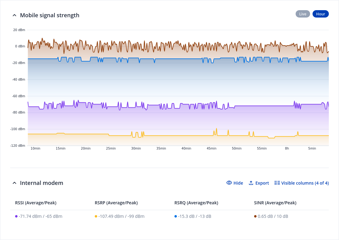 You can navigate to different pages to display mobile signal strength values over different periods of time. This includes: