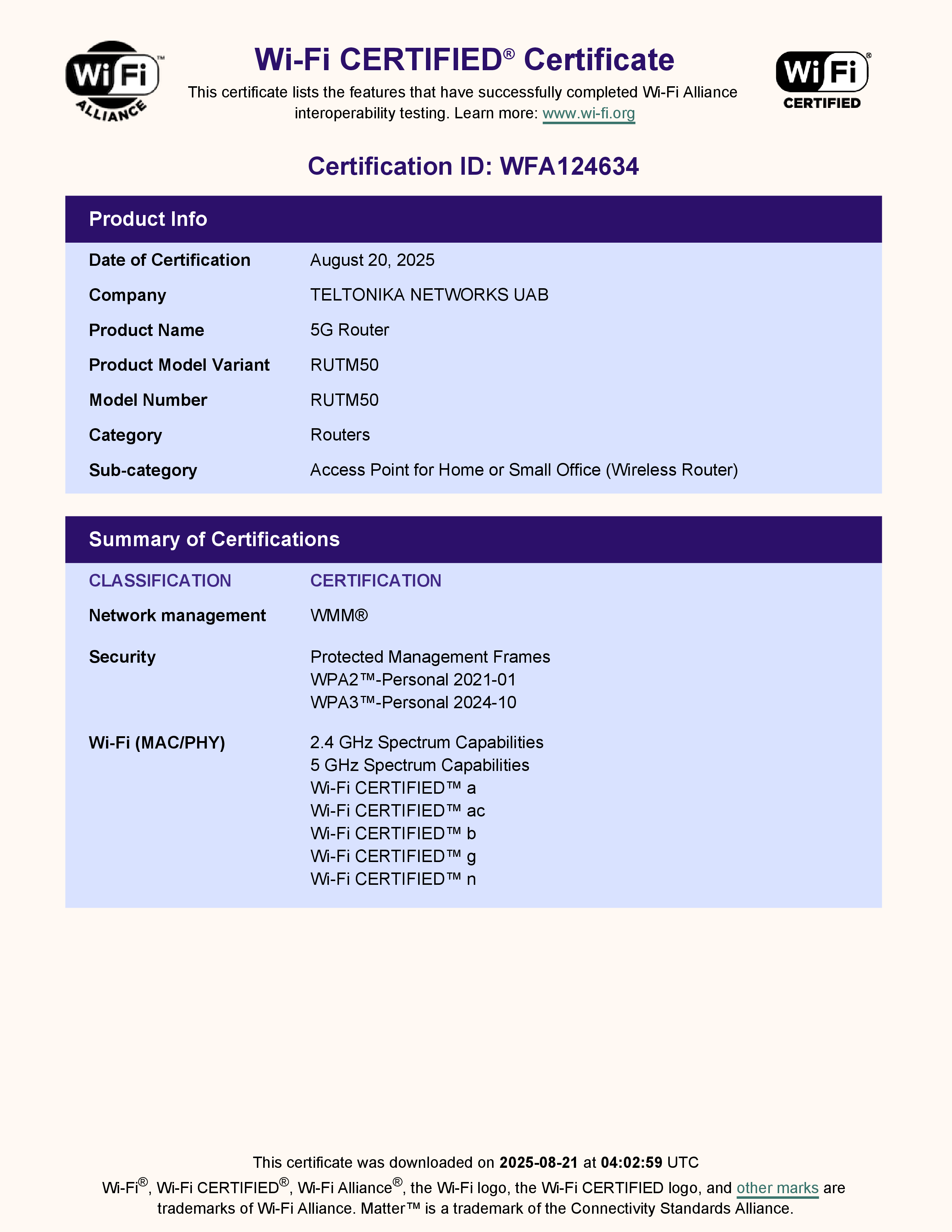 - 06:04, 21 August 2025 Lukas.Pipiras talk contribs set 154534 as the approved revision for "RUTM50 Wi-Fi CERTIFIED"