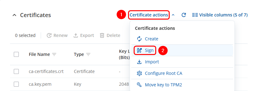 If the "Sign the certificate" option is not enabled while creating the certificate, the router generates only the private key and the certificate signing request. This request is not a valid certificate until it is signed later, either by the router using its own certificate authority or by an external source. The router can also import certificate requests from external devices and sign them before they are used for secure communication.