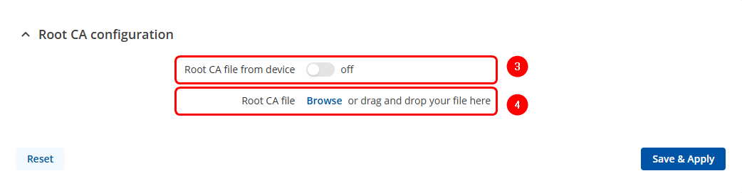 - Enable Root CA file from the device option, if Root CA file has already been imported.