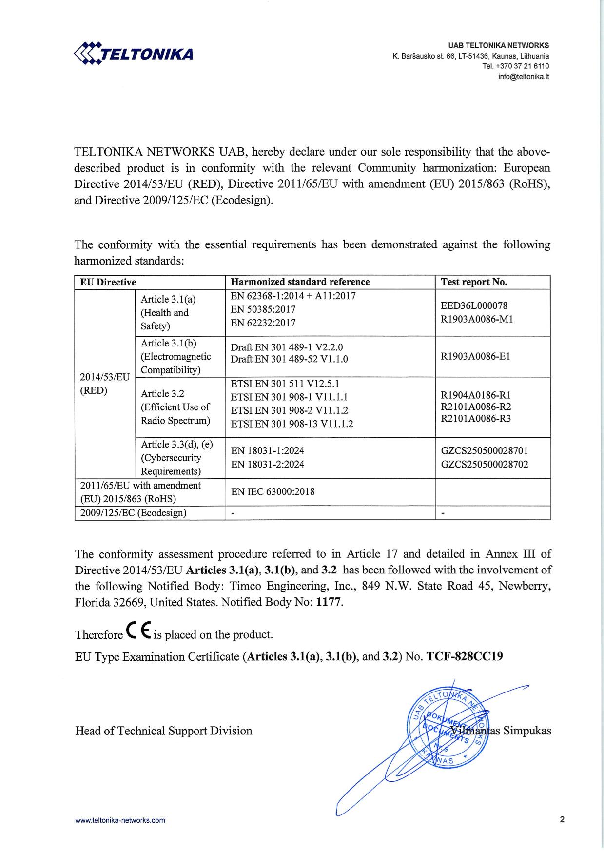EU Type Examination Certificate (Articles 3.1(a), 3.1(b), and 3.2) No.: TCF-828CC19