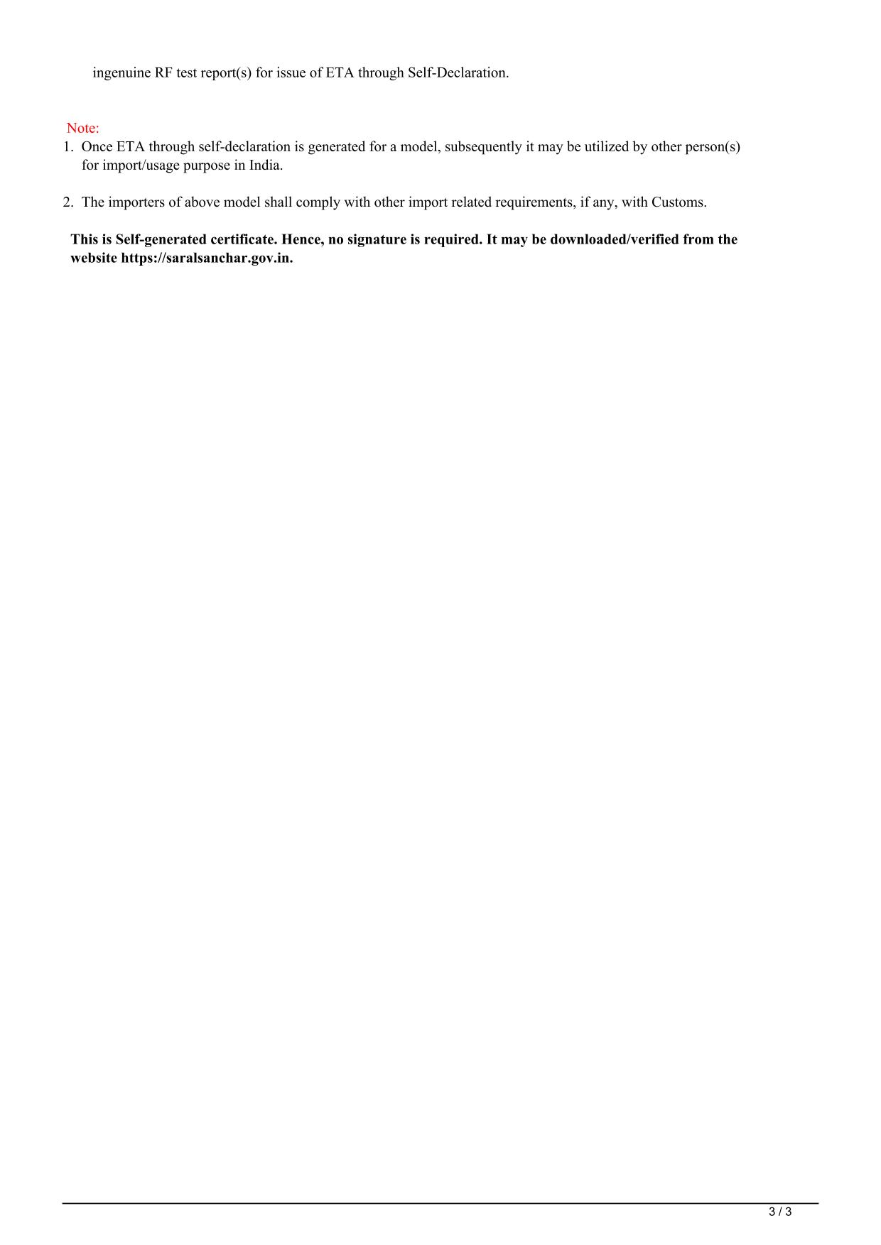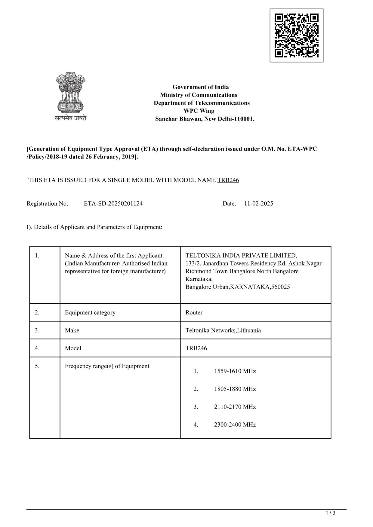 TRB246 was approved in accordance with the self-declaration issued under O.M. No. ETA-WPC/Policy/2018-19 dated 26 February, 2019.