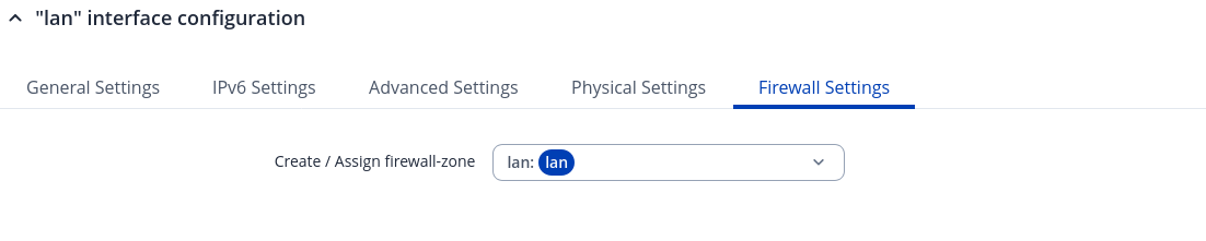 | Create / Assign firewall-zone | firewall zone; default: lan | Choose the firewall zone you want to assign to this interface. Select 'Unspecified' to remove the interface from the associated zone or define a new zone and attach the interface to it. |