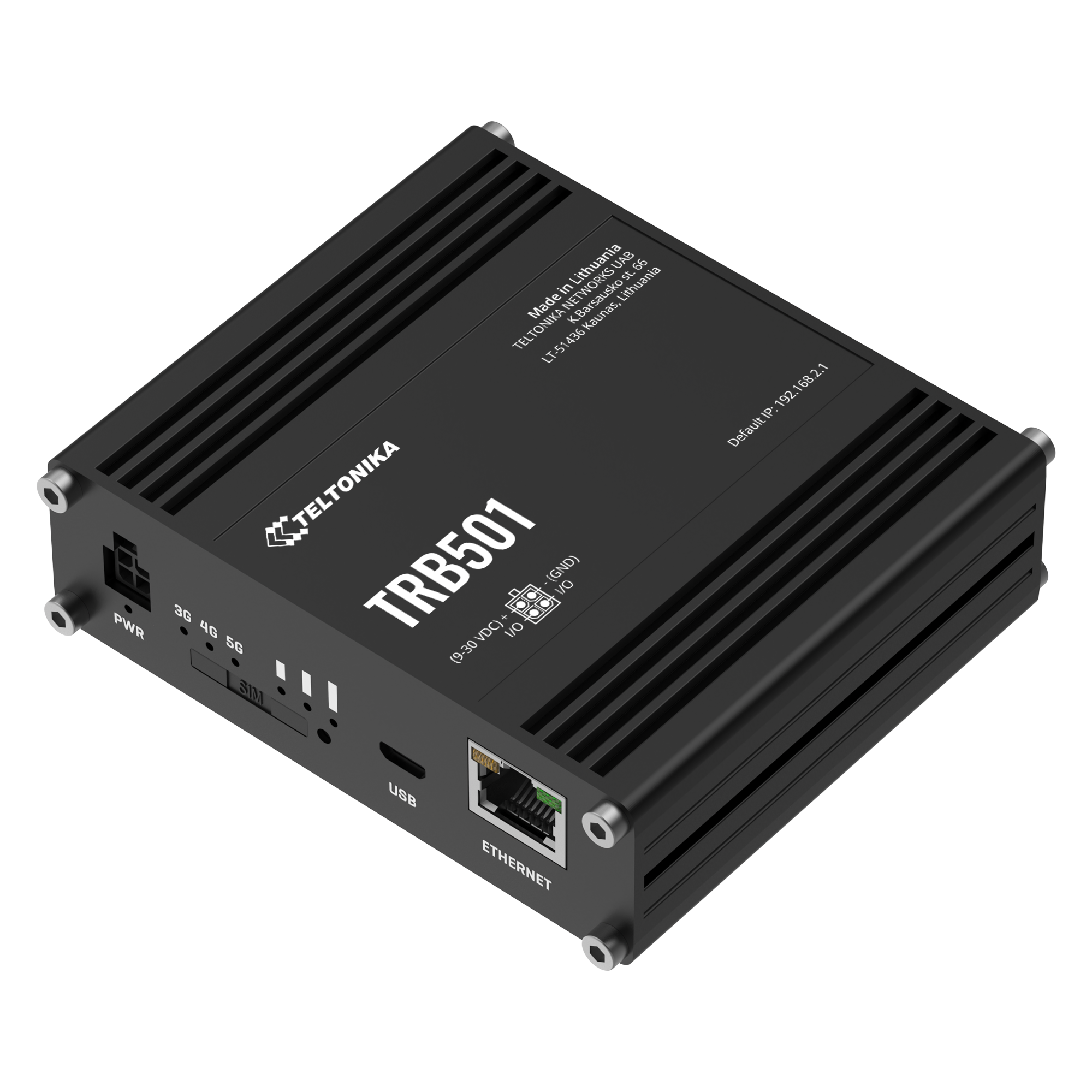 TRB501 is a compact industrial 5G gateway equipped with a 2.5 Gigabit Ethernet port, Micro-USB, a powerful CPU and RutOS software for advanced networking solutions.